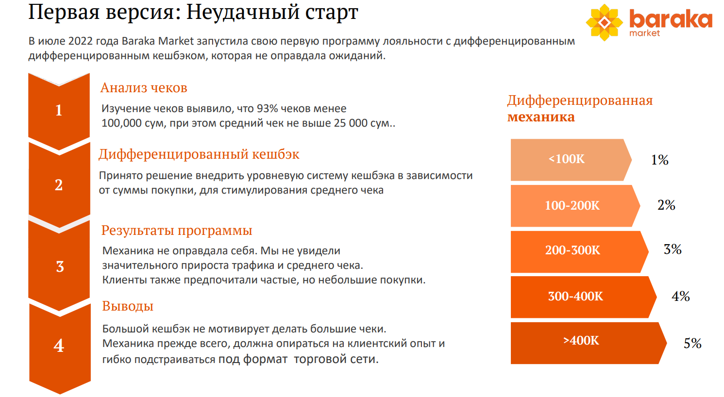 Первым делом мы решили стимулировать средний чек. Механика была простая, размер кешбэка зависел от суммы чека:
