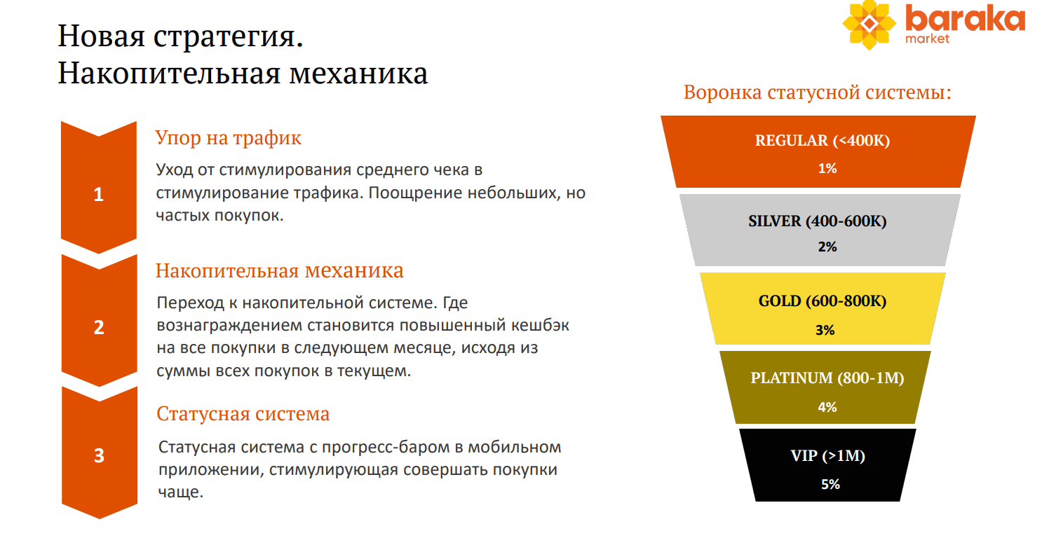 Через год мы перешли к механике, в которой кешбэк зависит не от суммы чека, а от уровня в программе. Можно купить жвачку и получить 5% кешбэка. Но, чтобы заработать статус, покупателю нужно потрудиться в предыдущем месяце: приходить чаще и покупать больше. Сумма всех покупок за месяц складывается и определяет статус лояльного клиента с фиксированным уровнем кешбэка, которым он пользуется весь следующий месяц без ограничений. Чем больше человек тратит у нас в прошлом месяце, тем больше бонусов он получит за покупки в следующем. Статусов у нас всего пять: