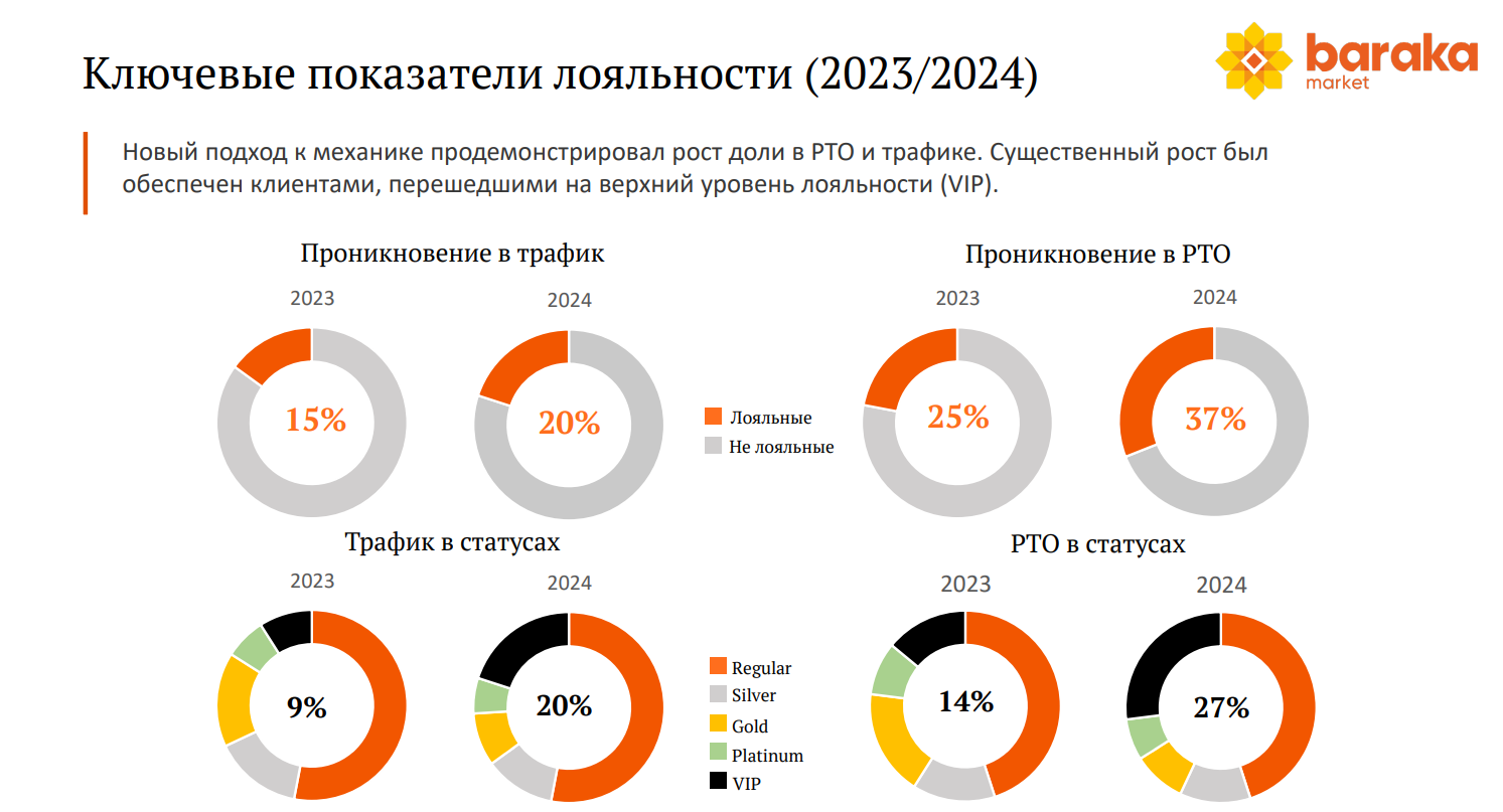 За год проникновение программы лояльности в чеки сети выросло с 15 до 20%, т.е. 20% наших активных клиентов стабильно предъявляют при покупках карту лояльности и копят бонусы. Уровневая программа сработала: мы не только увидели, что покупатели стали тратить больше и перемещаться на более высокие статусы, но и привлекли дополнительную аудиторию.