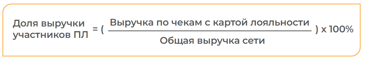 Доля выручки от участников ПЛ = ({сумма денежных средств по чекам продажи, в которых была применена карта лояльности} − {сумма денежных средств по чекам возврата}) ÷ ({сумма денежных средств по чекам продажи} − {сумма денежных средств по чекам возврата}) × 100%