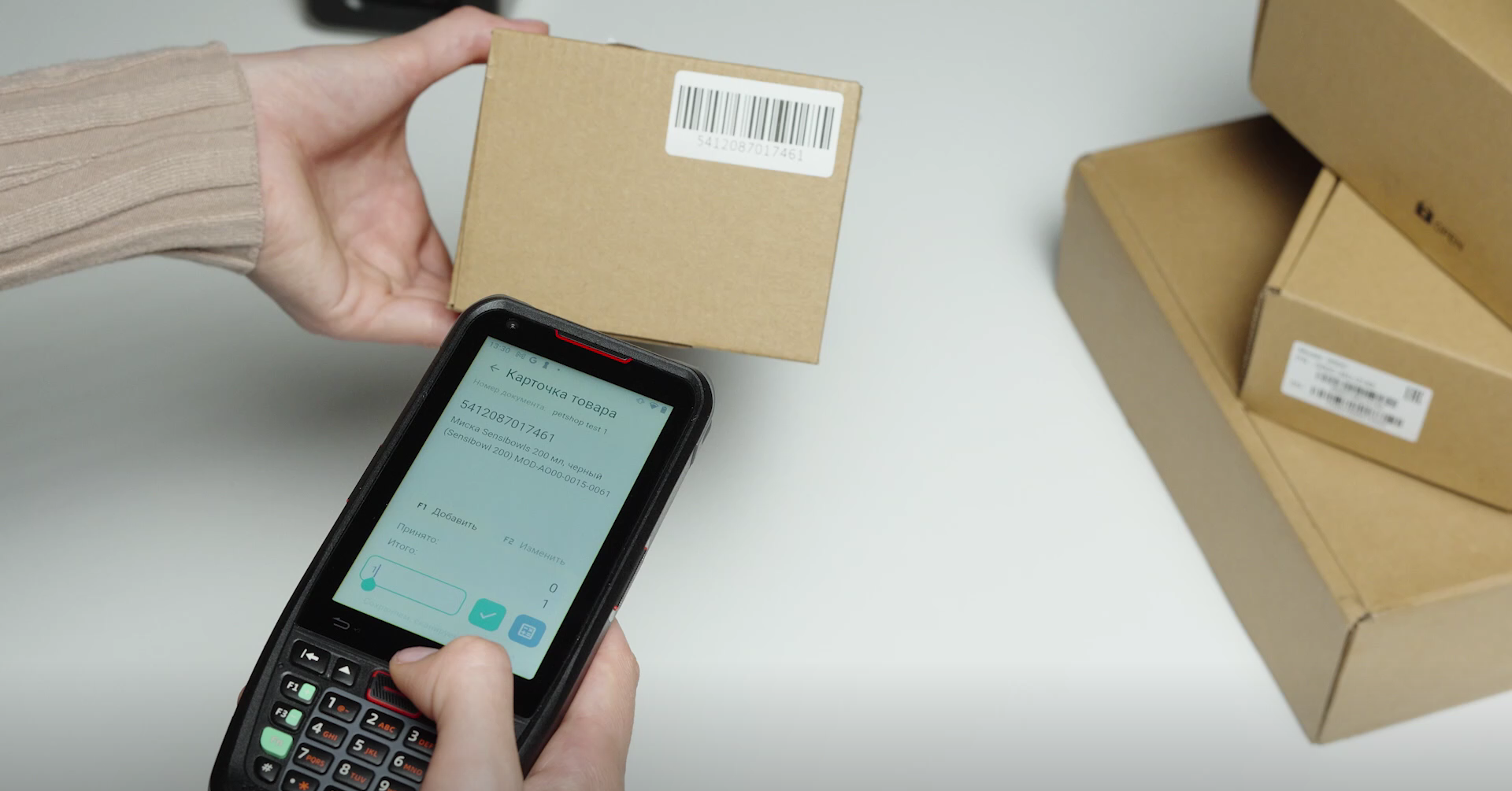 Приёмка товаров по документу-основанию с помощью сканирования штрихкода с упаковки (паллеты, коробки), возможностью сразу ввести итоговое количество и проверить марки и акцизы.